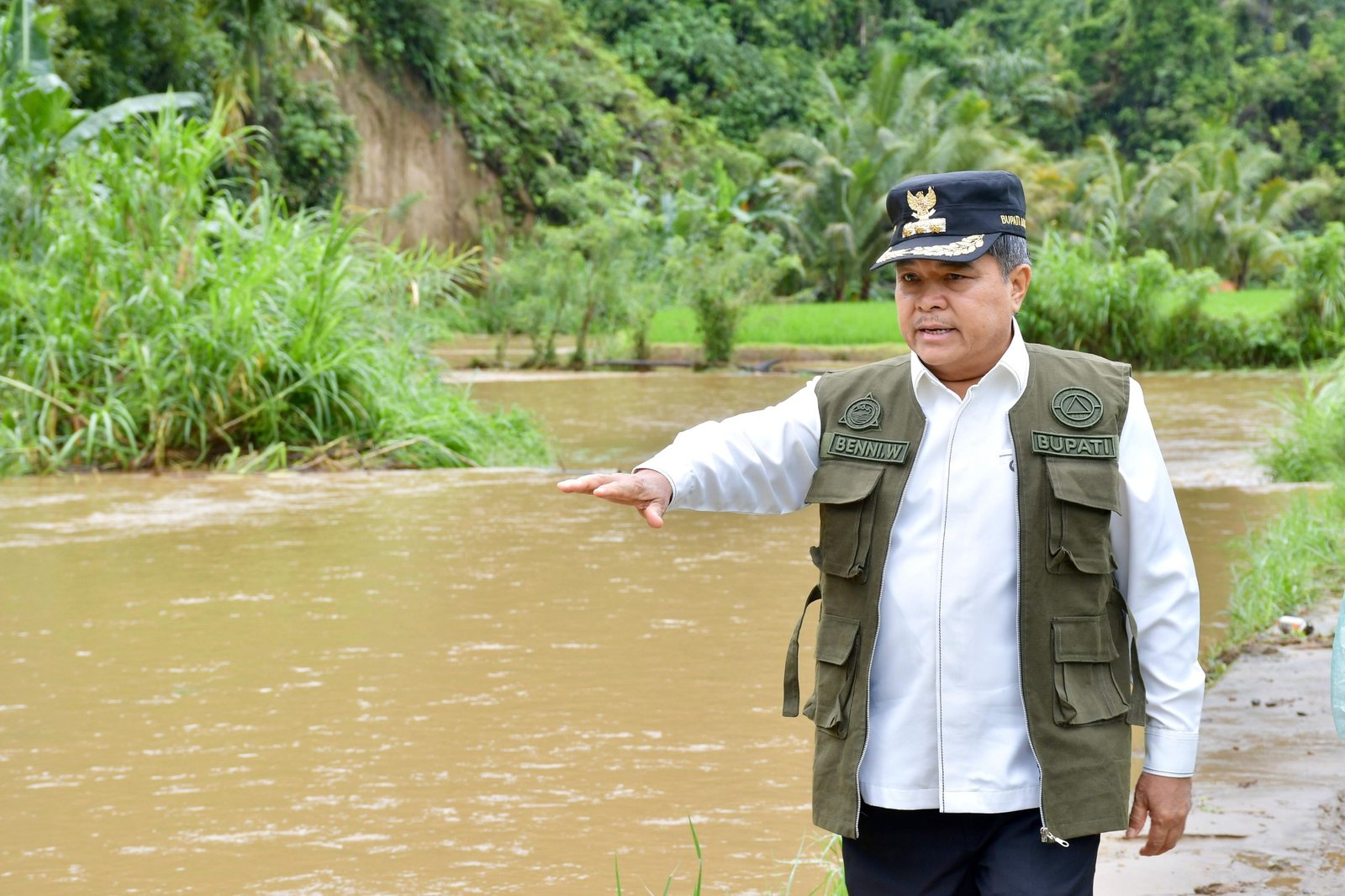 Guna penanganan maksimal, Bupati Kabupaten Agam, Provinsi Sumatera Barat ( Sumbar ), Ir H Benni Warlis MM, Dt Tan Batuah, meninjau langsung kondisi banjir yang melanda Jorong Lurah Dalam, Nagari Pasie Laweh, Kecamatan Palupuh, Rabu ( 26 / 11 ).