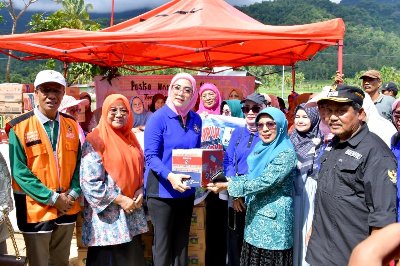 Ketua TP-PKK Kabupaten Agam, Provinsi Sumatera Barat ( Sumbar ) Ny Merry Benni Warlis, dampingi rombongan Badan Kerjasama Organisasi Wanita (BKOW) Sumbar, dalam penyaluran bantuan bagi warga terdampak bencana di Nagari Duo Koto, Kecamatan Tanjung Raya, dan Nagari Tiku V Jorong, Kecamatan Tanjung Mutiara, Sabtu (29/11).